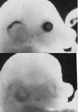 Par la suite, l'induction de la placode cristalline, et donc l'initiation du cristallin est déclenchée par deux facteurs principaux, premièrement l'expression de Pax6 dans l'épiderme de la tête, et deuxièmement la présence du tissu ectodermique spécifique. Les étapes du développement précoce du cristallin liées à Pax6 et à d'autres gènes sont profondément ancrées dans l'histoire de l'évolution et remarquablement similaires à travers les espèces. Pax6 lui-même est absolument identique chez la souris et chez l'homme. Les gènes cités, Pax6, Rx1 et Six3 sont un cercle nécessaire et suffisant pour l'induction de l'œil chez le vertébré. En utilisant du Pax6 de souris, une expérience a pu induire des yeux (ectopiques) sur les jambes de mouches drosophiles[4]. Cette expérience spectaculaire, avec laquelle la fonction du gène eyeless de la mouche homologue de Pax6 a été complètement remplie a démontré le haut niveau de conservation de Pax6. Une expérience semblable a réussi au moins en partie chez des vertébrés[5], notamment chez le poussin (1995)[6] ou au moyen de Sox3 chez le Xenopus laevis (2000)[7]. Dans ces expériences on a provoqué la formation de cristallins ou de placodes ectopiques. Le fait que ces essais n'ont pas conduit à des résultats aussi complets que chez les drosophiles fait conclure à la plus haute complexité des vertébrés. En tout cas, le développement de l'œil est complètement supprimé quand Pax6 est réprimé (Fig. 3).