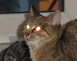 Il faut aux vertébrés répondre à des besoins spécifiques, comme pour la perception dans l'obscurité (chats, oiseaux de nuit), ou une acuité visuelle à grande distance (rapaces). En particulier les chats, mais aussi les chiens, les chevaux et les bœufs ont développé par exemple comme renforcements de la lumière résiduelle pour une meilleure vision nocturne une couche rétroréfléchissante derrière ou au milieu de la rétine, le tapetum lucidum (Fig. 14)[45]. Chez les rapaces, d'autres différences de développement apparaissent. Leurs yeux sont relativement grands, ce qui permet une grande réception de lumière et ainsi une grande image de l'objet observé sur la rétine et dans le cerveau. La division de l'objet fixé sur une plus grande surface, donc un plus grand nombre de cellules de la rétine, conduit à une image plus riche en détails.