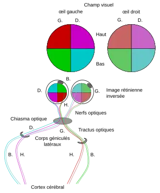 Outre les bâtonnets et les cônes comme photorécepteurs de l'œil, la rétine forme aussi quelques millions de cellules nerveuses pour un premier traitement de l'information. Pour que l'œil puisse fonctionner comme organe des sens, il faut que les informations lumineuses incidentes soient transmises au cerveau comme à une « station d'utilisation de niveau supérieur[2] ». Tout d'abord, il se forme sur la couche interne de la rétine (Fig. 10, g.) des cellules ganglionnaires. Ces cellules forment des axones qui traversent la rétine, puis doivent ensuite chercher et trouver des buts définis dans le cerveau. Le pilotage de cette recherche de buts topographique est un processus auto-organisé (guidage axonal). Ce sont des processus chimiques compliqués qui en sont responsables : des molécules dans la rétine et dans le cerveau moyen (tectum) forment des gradients chimiques étagés. Les gradients de concentration qui en découlent par diffusion, aident à diriger la direction de croissance des axones[32]. Les axones sont rassemblés sur la tache aveugle et chez les mammifères, conduits de là comme cordon nerveux central, le nerf optique, par la voie visuelle avec diverses structures neuronales vers le cortex visuel (Fig. 11). Après une étape intermédiaire, ils atteignent d'abord le centre visuel primaire pour un traitement préliminaire, puis le centre visuel secondaire. Sur ce chemin, il se passe un croisement partiel des nerfs optiques, le chiasma optique. Les axones du nerf optique de l'œil gauche correspondant à la moitié gauche de la rétine, c'est-à-dire la moitié droite du champ visuel, atteignent le centre optique primaire de la moitié gauche du cerveau et inversement pour l'autre côté du même œil, et également pour ceux de l'œil droit. Dans le domaine de réception du cerveau, il faut que les cellules arrivant déjà en nombreuses fibres isolées soient encore triées, afin qu'un traitement précis soit possible. Un deuxième tri entre parties supérieure et inférieure du champ visuel a lieu dans les « corps géniculés latéraux ». Les axones aboutissent selon leur origine dans des diverses aires étroitement délimitées. Ce processus s'appelle projection rétino-tectale. Il est substantiellement régi par des gradients d'éphrine et des récepteurs pour l'éphrine[32],[33]. À une carte sur la rétine correspond une copie dans le cerveau. Chez les vertébrés autres que les mammifères (poissons, amphibiens, reptiles et oiseaux) il se forme un croisement complet des voies optiques. Tous les axones d'un œil d'un côté sont conduits sur le côté opposé du cerveau[2]. L'effet du croisement des nerfs optiques peut être démontré expérimentalement chez le Xenopus laevis, en supprimant une coupe oculaire et la réimplantant de l'autre côté. Il s'ensuit une association sans croisement des régions de la rétine dans le cerveau moyen[34]. L'animal cherchant sa nourriture dirige sa langue dans des directions fausses, et n'apprend qu'avec le temps une orientation correcte.