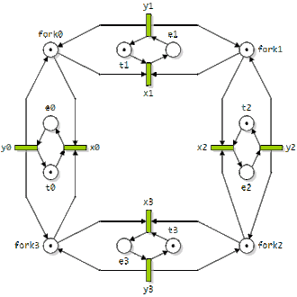 - Penseur : Le philosophe pense durant une période indéterminée. Il n'a aucune fourchette dans la main et ne cherche pas à en avoir. Cet état peut être comparé à un processus qui dort.