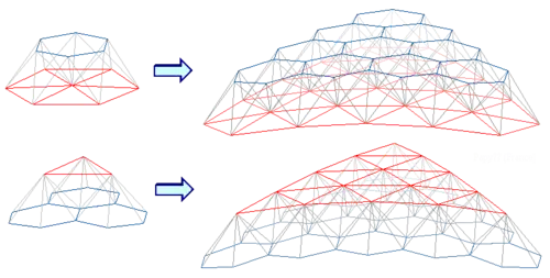 Quand une géode est de grandes dimensions, il peut être intéressant, au point de vue architectural, d'en renforcer la cohésion en superposant deux coupoles géodésiques, duales l'une de l'autre. Il y a deux façons de réaliser ce renforcement :