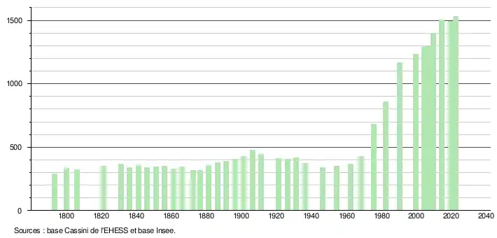 L'évolution du nombre d'habitants est connue à travers les recensements de la population effectués dans la commune depuis 1793. Pour les communes de moins de 10 000 habitants, une enquête de recensement portant sur toute la population est réalisée tous les cinq ans, les populations de référence des années intermédiaires étant quant à elles estimées par interpolation ou extrapolation[28]. Pour la commune, le premier recensement exhaustif entrant dans le cadre du nouveau dispositif a été réalisé en 2004[29].
