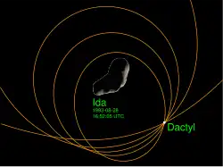 D'après des simulations informatiques, le périapside de Dactyle doit être supérieur à 65 kilomètres d'Ida pour lui permettre de rester sur une orbite stable[17]. Le nombre d'orbites générées par les simulations a été réduit par la nécessité de faire passer l'orbite là où Galileo observa Dactyle à 16:52:05 UT le , soit à environ 90 km d'Ida[18],[19]. Le , le télescope spatial Hubble observa Ida pendant huit heures et fut incapable de détecter Dactyle. Il aurait pu l'observer si la lune s'était trouvée à plus de 700 km d'Ida[16].