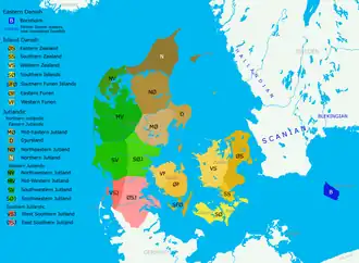 - le Danemark métropolitain, constitué de la péninsule continentale du Jutland, ainsi que 443 autres îles dont une vingtaine seulement se situent en mer Baltique (îles danoises). Les plus grandes îles sont Seeland, sur laquelle est située Copenhague, Vendsyssel-Thy et la Fionie ;