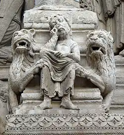 - Les lions : Le nombre de lions varie entre deux et sept et leur forme est rarement naturaliste. Sans doute peu de sculpteurs ont-ils eu l’occasion d'en voir. L'Antiquité aimait à les montrer prosternés, léchant le sol ou bien les pieds du prophète et, lorsque nous retrouvons ce schéma au XIIe siècle, nous pouvons le considérer comme un archaïsme. Habituellement les lions sont disposés de façon naturelle, en mode affronté ou adossé-détourné. Dans leur majorité les bêtes ont la queue rentrée remontant entre les cuisses et souvent terminée fleurdelisée.