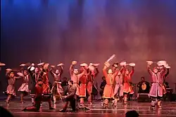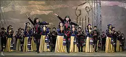 La danse Mtioulouri (მთიულური) vient de la région montagneuse de Mtioulétie, située au Nord de la Géorgie. Elle illustre la compétition entre deux groupes d’hommes, célébrant l’habileté et l’adresse[26].