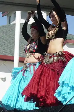- un costume composé d'éléments traditionnels empruntés à différentes cultures : une ou deux jupes longues très amples portées sur un sarouel (pantalon bouffant) ; un choli (blouse courte indienne traditionnellement portée sous un sari) sous un soutien-gorge décoré ; une ceinture souvent superposée à un foulard autour des hanches ; un turban ou un hair garden (cheveux ornés de fleurs et de bijoux) ; de nombreux bijoux ethniques portés sur les bras et les poignets, autour du cou, sur la tête ; des tatouages éphémères (dessinés avec du khôl) d'inspiration berbère ; des sagattes (cymbalettes de doigts) pour accompagner la musique...