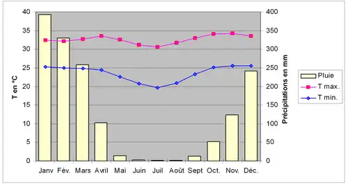 | Température moyenne (°C) | 28,6 | 28,4 | 28,6 | 28,6 | 27,3 | 25,6 | 25,2 | 25,9 | 28 | 29,3 | 29,6 | 29,3 | 27,9 |