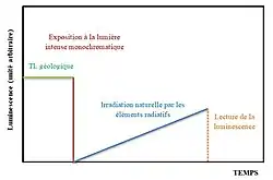 Si ensuite ces grains minéraux sont stimulés par une lumière (bleue ou verte pour l’OSL, infrarouge pour IRSL) ou par une source de chaleur (pour TL), un signal de luminescence est émis chaque fois que l'énergie électronique instable stockée est libérée. L’intensité de ce signal varie selon sur la quantité de rayonnement absorbée durant l'enfouissement et selon les propriétés spécifiques du minéral.