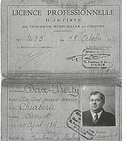 Source : Licence professionnelle d'artiste no 275 délivrée le 18/10/1933 par le syndicat des artistes de concerts, music-halls et cirques, 61 Faubourg Saint-Martin, Paris 10e, en tant que chanteur comique comédien .