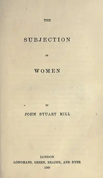 - ↑ (en) John Stuart Mill, The Subjection of Women, Londres, Longmans, Green, Reader & Dyer., 1869 first ed.