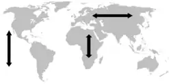 En effet, les espèces animales et végétales domestiques l'ont été dans une zone bien précise et souvent peu étendue. Pour que les peuples agriculteurs puissent s'étendre, il faut donc que leurs cultures et leur bétail puissent les suivre. Or si le climat varie trop vite d'une région à l'autre, il est plus difficile de faire pousser des cultures en des lieux variés ; le climat changeant plus facilement avec la latitude qu'avec la longitude, il sera plus facile d'acclimater les plantes et animaux selon un axe est/ouest comme en Eurasie que selon un axe nord/sud comme aux Amériques. De fait la culture du blé s'est répandue en quelque 3 000 ans de l'Irlande au Japon alors que le maïs n'était pas exploité en Californie ou dans la pampa 6 000 ans après sa domestication.