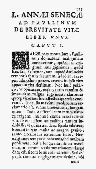 La douleur vaine, la joie stupide, le désir avide, la conversation flatteuse : tout cela nous fait perdre notre temps, et réduit en cendres la durée de notre existence. La cause de cette insouciance : chacun vit comme s'il devait vivre pour l'éternité, mais la fragilité de l'existence ne vient souvent que trop tard.