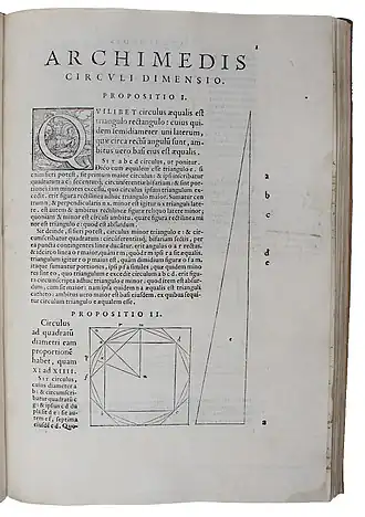 « La circonférence d'un cercle quelconque est égale au triple du diamètre réuni à une certaine portion du diamètre, qui est plus petite que le septième de ce diamètre, et plus grande que les 10/71 de ce même diamètre[3]. »