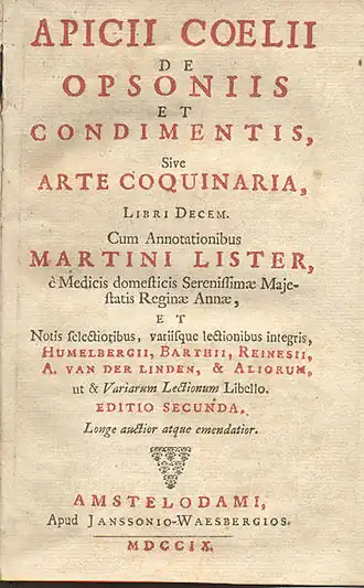 - Apicii Coelii. De opsoniis et condimentis, sive arte coquinaria, libri decem. Cum annotationibus Martini Lister.