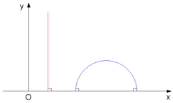 Les géodésiques[1] sont les demi-droites (au sens euclidien) verticales : x = cte (en rouge) et les demi-cercles (au sens euclidien) perpendiculaires à l'axe des abscisses : y = 0 (en bleu) :