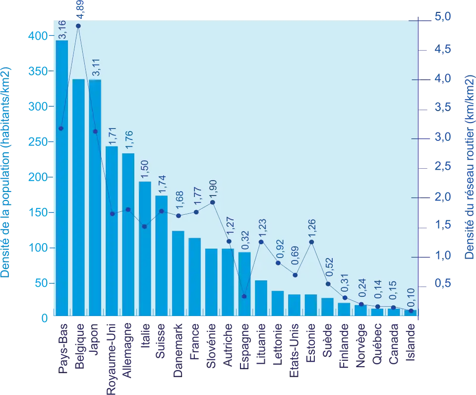 Le graphique ci-après représente les densités de réseaux par pays comparées aux densités de population[1].
