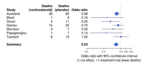Le graphique en forêt présenté en tête de cet article est tiré d'une revue systématique qui examine les essais cliniques menés quant à l'utilisation de corticostéroïdes pour accélérer le développement pulmonaire des fœtus lorsque les risques d'accouchement prématuré sont élevés. Bien que suffisamment de preuves aient été rassemblées pour démontrer l'efficacité de ce traitement dans la préservation de la vie des nourrissons à naître, il n'était pas largement connu et utilisé, et d'autres recherches ont été menées sur la même question. Cependant, une fois que la revue systématique a permis de mieux diffuser les preuves, ce traitement a été largement utilisé, contribuant ainsi à sauver des milliers de bébés prématurés de la mort due au syndrome de détresse respiratoire du nourrisson[12].