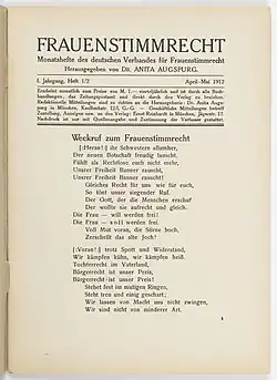 Après sa création, la revue Die Frauenbewegung (de), publiée par Minna Cauer depuis 1895, devient l'organe de l'association. En raison de l'exigence de neutralité politique, l'Assemblée générale estime en 1907 que la revue ne peut plus représenter le Deutscher Verband car elle représente la direction radicale du mouvement des femmes. Le Zeitschrift für Frauenstimmrecht (de), devient alors la publication officielle, édité par Anita Augspurg. La devise du magazine est « La justice exalte un peuple »[5].
