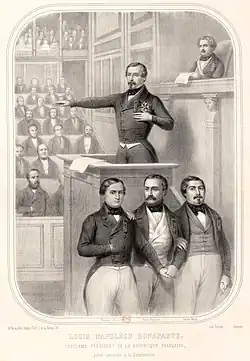 Une nouvelle loi réduit la liberté d'expression dans la presse (). Les républicains se scindent : la majorité opte pour une action légale, la minorité, soutenue par les chefs en exil, préconise l'action de sociétés secrètes, qui sont particulièrement nombreuses dans la vallée du Rhône[84]. Cette mise au silence de la faction républicaine n'est pas sans conséquences sur les relations entre le président et le parti de l'Ordre, qui se sent désormais libre d'afficher des désaccords croissants avec Bonaparte, notamment en ce qui concerne ses idées sociales. Ce dernier rend également les conservateurs responsables de la mutilation du suffrage universel, qu'il condamne. Peu à peu, un « parti de l’Élysée » se crée[85].