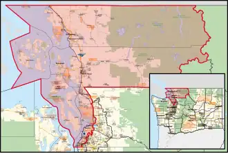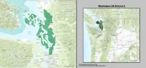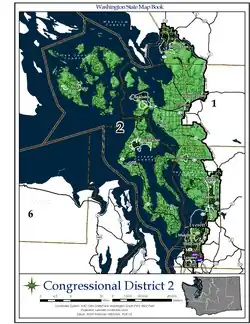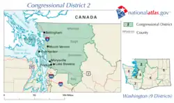 Le 2e district congressionnel de Washington comprend la totalité des comtés d'Island, San Juan, Skagit et Whatcom, ainsi que le comté côtier ouest de Snohomish. Il s'étend de Bellingham et de la frontière canado-américaine au nord jusqu'à la limite du comté de Skagit/Snohomish, avec une étroite bande le long de la côte jusqu'à Lynnwood et la limite du comté de King/Snohomish au sud. Depuis 2001, il est représenté par le Démocrate Rick Larsen.