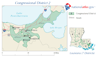 Le 2e district congressionnel de la Louisiane contient presque toute la ville de la Nouvelle-Orléans et s'étend à l'ouest et au nord jusqu'à Baton Rouge. Le district est actuellement représenté par le Démocrate Troy Carter. Avec un indice de vote CPVI de D + 25, c'est le seul district démocrate de Louisiane[1].