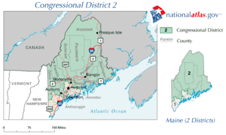 Le arrondissement comprend l'intégralité des comtés suivants à l'exception de Kennebec, qu'il partage avec le 1er district. Les villes et villages du Comté de Kennebec dans le district comprennent Augusta, Belgrade, Chelsea, Farmingdale, Fayette, Gardiner, Hallowell, Manchester, Monmouth, Mount Vernon, Oakland, Randolph, Readfield, Rome, Sidney, Vienne, Wayne et Winthrop.