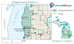 Le 2e district congressionnel du Michigan est un district situé dans l'ouest du Michigan. Le 2e district actuel contient une grande partie de l'ancien 4e district congressionnel du Michigan et comprend la totalité des comtés de Barry, Clare, Gladwin, Gratiot, Ionia, Isabella, Lake, Manistee, Mason, Mecosta, Montcalm, Newaygo, Oceana et Osceola, ainsi que parties des comtés d'Eaton, de Kent, de Midland, de Muskegon, d'Ottawa et de Wexford[1]. Le Républicain John Moolenaar, qui représentait auparavant l'ancien 4e district, a été réélu pour représenter le nouveau 2e en 2022,