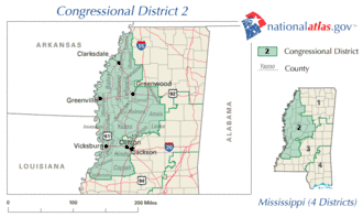 Le 2e district congressionnel du Mississippi couvre une grande partie de l'ouest du Mississippi. Il comprend la majeure partie de Jackson, les villes riveraines de Greenville et Vicksburg et les villes commerçantes intérieures de Clarksdale, Greenwood et Clinton. Le district mesure environ 443 km de long, 290 km de large et borde le fleuve Mississippi ; il englobe une grande partie du delta du Mississippi et un total de 15 comtés et des parties de plusieurs autres. C'est le seul district à majorité noire de l'État. Avec un indice de vote CPVI de D+11, c'est également le seul district Démocrate du Mississippi[1].