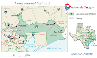 Le 2e district congressionnel du Texas se trouve dans la partie sud-est de l'État du Texas. Il englobe des parties du nord et de l'est du Comté de Harris et du sud du Comté de Montgomery, au Texas.
