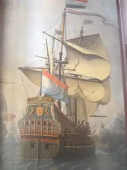 Alors qu'en Angleterre prévaut une organisation unifiée, ce n'est guère possible aux Provinces-Unies, organisées au niveau fédéral. Cinq Amirautés différentes (Middelburg, Rotterdam, Amsterdam, Hoorn et Harlingen)[26] dans trois provinces côtières (Zélande, Hollande et Frise) se disputent les pouvoirs, et les différents gouverneurs sont rarement prêts à investir d'importantes sommes d'argent dans l'expansion de la flotte[27]. Néanmoins, Johan de Witt fait renoncer les amirautés provinciales à une partie de leur indépendance en échange de rémunérations plus élevées. De cette façon, il réorganise l'administration navale et complète ces efforts par un programme de construction plus important[28]. L'ancienne flotte des Provinces-Unies de 80 navires de guerre, avec une moyenne de 34 canons, a été renforcée à la fin de 1653 par 64 nouveaux navires (chacun de 44 à 60 canons). Ceux-ci ne peuvent pas être vendus par une décision des états généraux. Les navires sont lancés et activés si nécessaire (réparés, gréés et équipés). Ces navires, achevés trop tard pour les batailles de 1653, sont immédiatement disponibles pour une nouvelle guerre[29]. À cela s'ajoutent les 80 à 90 navires plus petits et légèrement armés (la plupart du temps plus anciens), dont la tâche principale est de protéger les convois[28].