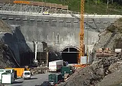 Entrée du tunnel côté Laveissière. À gauche de l'image, l'entrée du premier tunnel routier désormais fermé à la circulation. | |