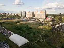 Le bâtiment qui abrite la station, encadré par les voies de la gare de Deviatkino. | ||||||||
