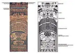 Selon la vision manichéenne de l'univers, le monde est formé de dix couches du ciel et de huit couches de la Terre. La section supérieure séparée représente le paradis, en dessous se trouvent les palais du soleil (à droite) et de la lune, qui sont représentés en deux cercles. Ensuite, les dix couches du ciel, où les anges, les démons et les douze signes du zodiaque sont inclus. Au-dessous des dix firmaments du ciel se trouvent les huit couches de la Terre, le mont Meru est représenté comme une montagne en forme de champignon sur le sol où vivent les humains ; et l'enfer est représenté dans la partie la plus basse[3],[4].