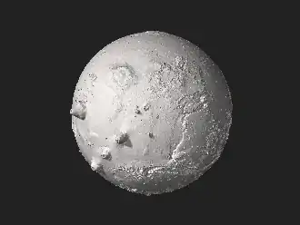 Le pôle sud aurait été percuté par un objet céleste ferreux au moins équivalent à la taille de la Lune provoquant un volcanisme géant durant 3 milliards d'années, le magma se serait ensuite solidifié[18],[19].