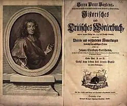 Historisches und critisches [kritisches] Wörterbuch / Pierre Bayle. Nach d. neuesten Aufl. von 1740 ins Dt. übers.; auch mit e. Vorrede u. verschiedenen Anm. versehen von Johann Christoph Gottsched, Leipzig, 1741-1744, 4 volumes. (traduction de l'édition de 1740). Tome I: A-B; Tome II: C-J; Tome III: K-P; Tome IV: Q-Z.