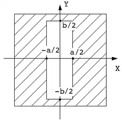 Pour une ouverture rectangulaire de largeur a et de hauteur b, en prenant l'origine O au centre de symétrie, l'intégrale se simplifie et devient calculable: