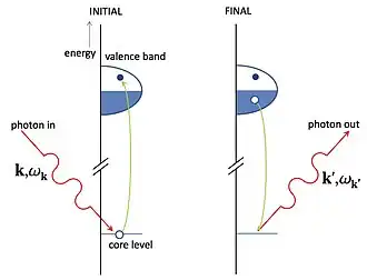 Comme un électron a été créé dans une bande de valence vide et un trou dans une couche remplie, le résultat net est un état final avec une excitation du trou d'électron. Si le trou est dans une couche de valence remplie, l'excitation du trou d'électron peut se propager à travers le matériau en emportant l'énergie et de la quantité de mouvement. La conservation de la quantité de mouvement et de l'énergie exigent que ceux-ci sont égaux à la perte de la quantité de mouvement et l'énergie du photon diffusé.