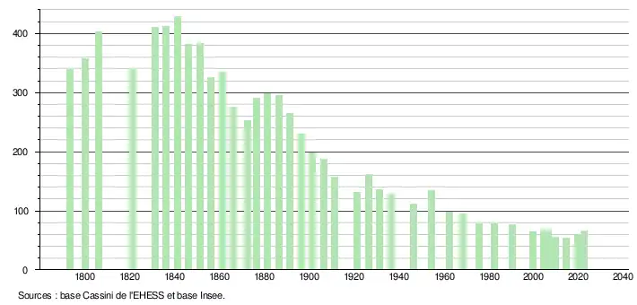 L'évolution du nombre d'habitants est connue à travers les recensements de la population effectués dans la commune depuis 1793. Pour les communes de moins de 10 000 habitants, une enquête de recensement portant sur toute la population est réalisée tous les cinq ans, les populations de référence des années intermédiaires étant quant à elles estimées par interpolation ou extrapolation[16]. Pour la commune, le premier recensement exhaustif entrant dans le cadre du nouveau dispositif a été réalisé en 2004[17].