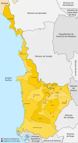 - ↑ La préfecture apostolique de Chocó est érigée le 28 avril 1908 par décret de la congrégation pour les affaires ecclésiastiques extraordinaires en prenant sur le territoire du diocèse de Antioquia[3](aujourd'hui archidiocèse de Santa Fe de Antioquia). La mission est confiée aux missionnaires clarétains[4]. Le 5 février 1917, elle donne la municipalité d'El Carmen de Atrato au diocèse de Jericó[5]. Elle cède une portion de territoire le 14 novembre 1952 pour la création des vicariats apostoliques de Quibdó et d'Istmina[6](aujourd'hui diocèse de Quibdó et diocèse d'Istmina-Tadó). La préfecture de Chocó est supprimée le 17 décembre suivant et son territoire est divisé pour la création des diocèses d'Armenia et Pereira[7].