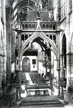 - ↑ André Guy, La cathédrale de Moulins, Préface d'Émile Male, Moulins, Les Imprimeries Réunies, 1950. Voir notamment la photographie hors texte du chœur de la cathédrale.