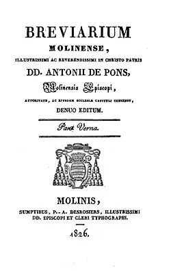 - ↑ Officia propria ad usum dioecesis Molinensis iuxta calendarium a SRC approbatum die 18 novembris 1963, de mandato RR. DD. Francisci-Alberti Bougon episcopi Molinensis edita. Concordat cum originali, Molinis, die 11 februari 1967, J. Chacaton