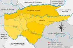 Il comprend tout le département de Guaviare composé des 4 municipalités : Calamar, El Retorno, Miraflores et San José del Guaviare ce qui correspond à un territoire de 42 327 km2 divisé en 16 paroisses.