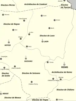 Si on reprend les limites du département de l'Aisne, celui-ci serait sur 3 diocèses. Le premier diocèse est Soissons au sud, le second diocèse est Laon au nord, et le troisième diocèse est celui de Noyon au Nord-Ouest qui comprenait le Vermandois.
