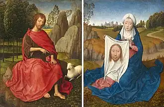 Saint Jean-Baptiste est reconnaissable notamment à ses vêtements et à la présence de l'agneau ; sainte Véronique est, d'après la tradition, une femme pieuse de Jérusalem qui, poussée par la compassion lorsque Jésus-Christ porte sa croix au Golgotha, lui donne son voile pour qu'il puisse essuyer son front. Si le paysage à l'arrière de Jean-Baptiste est campagnard et forestier, on voit à l'horizon derrière sainte Véronique une ville avec une cathédrale et diverses tours. Sur le panneau de saint Jean figure, en bas à gauche, une inscription en or ajoutée au XIXe siècle : H. V. D. GOES /1472, pour faciliter la vente au roi Maximilien Ier de Bavière. La date est impossible puisqu'un examen dendrochronologique a établi que l'arbre a été abattu vers 1473[1].