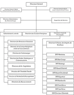 La DGI comprend une Administration centrale, une Direction opérationnelle, une Direction Urbaine dans la Ville de Kinshasa, une Direction Provinciale dans chaque province ainsi que les services extérieurs.