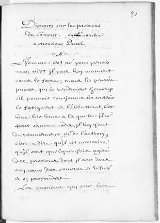 En 1843, les recherches de Victor Cousin l'amènent à la Bibliothèque royale[a], où il découvre parmi ce qu'il pense être le fonds de l'abbaye de Saint-Germain-des-Prés[5],[6],[b] , un recueil manuscrit in-quarto daté du XVIIe siècle[c] dont le sommaire indique un « Discours sur les passions de l'amour, de M. Pascal. ». Le texte lui-même[d] porte la mention « Discours sur les passions de l'amour — on l'attribue à M. Pascal[7] ». Le catalogue des manuscrits de la bibliothèque mentionne également, à l'entrée 74, un « Discours sur les passions de l'amour, par M. Pascal ». Pour Cousin, il ne fait aucun doute que le texte d'une vingtaine de pages est authentique : « Dès la première phrase, je sentis Pascal, et ma conviction s’accrut à mesure que j’avançais. Les preuves surabondent pour quiconque a eu un commerce intime avec les Pensées[5]. ». L’hypothèse de l’origine pascalienne du Discours a par ailleurs très vite emporté l’adhésion de nombreux critiques reconnus[6],[8].