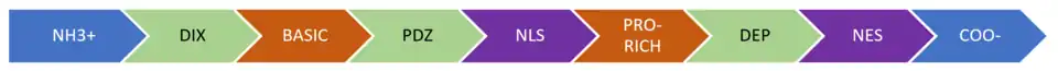 - Un domaine PDZ (Post synaptic density protein (PSD95), Drosophila disc large tumor suppressor (Dlg1), and Zonula occludens-1 protein (zo-1)). Son nom est formé par les initiales des trois premières protéines chez qui ce domaine structural récurrent a été identifié. Il contient généralement près de 73 acides aminés qui forment cinq ou six brins bêta et deux ou trois hélices alpha. Il joue un rôle essentiel dans la liaison des ligands et la conformation de la protéine Dvl et donc dans la régulation des processus biologiques[4].