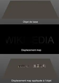 Le « displacement mapping » est une technique similaire au bump mapping, normal mapping, et au parallax mapping, mais qui utilise, contrairement aux autres techniques, une texture (qui peut être procédurale) ou ce que l'on appelle une « height map » (texture créant du relief dans certains cas) qui modifiera la position géométrique des points de la surface à laquelle on applique cette « displacement map ». Ces positions géométriques seront déterminées selon la valeur (représentée par une couleur) affectée à la texture. Cet effet donnera à la surface une grande précision et un grand nombre de détails. En revanche, c'est, parmi les autres techniques citées plus haut, celle qui demande le plus de ressources à l'ordinateur, gourmandise due à la grande quantité de « nouvelle géométrie ».