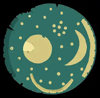 Le disque de Nebra se présente sous la forme d'une plaque circulaire sur laquelle se détachent des motifs en plaques incrustées d'or, motifs supposés être en partie des corps célestes : un croissant représentant la Lune, le disque central pouvant être le Soleil ou bien la Lune, un groupe de sept points serait la constellation des Pléiades[8], deux autres motifs en arcs.
